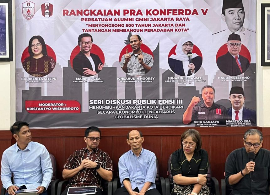 MARHAENIST — DPD Persatuan Alumni Gerakan Mahasiswa Nasional Indonesia (PA GMNI) Jakarta Raya kembali melanjutkan rangkaian Seri Diskusi Publik III pra-Konferda V dengan mengangkat tema “Menumbuhkan Jakarta Kota Berdikari secara Ekonomi di Tengah Arus Globalisasi Dunia”. Kegiatan yang digelar di Kantor DPP PA GMNI, Jakarta, Sabtu (08/11/2025), menghadirkan sejumlah narasumber, antara lain Anggota Komisi XIII DPR RI Marinus Gea, Pakar Ekonomi Kerakyatan Ichsanuddin Noorsy, Ketua Komite II DPD RI Badikenita Sitepu, serta Ketua Kelompok Pangan dan Ekonomi Daerah Biro Perekonomian dan Keuangan Pemprov DKI Jakarta Abdul Gofar Al Hakim.