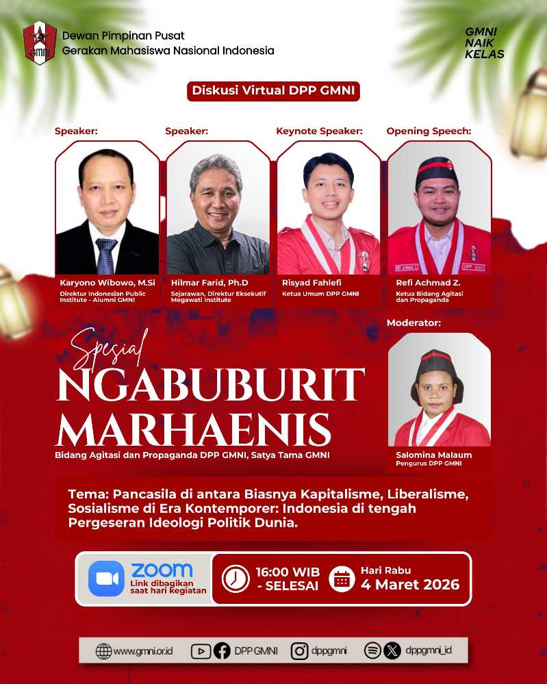 Marhaenist.id, Jakarta – Dewan Pimpinan Pusat (DPP) Gerakan Mahasiswa Nasional Indonesia (GMNI) kembali menggelar diskusi virtual bertajuk “Spesial Ngabuburit Marhaenis” yang diselenggarakan oleh Bidang Agitasi dan Propaganda DPP GMNI dibawah kepemimpinan…