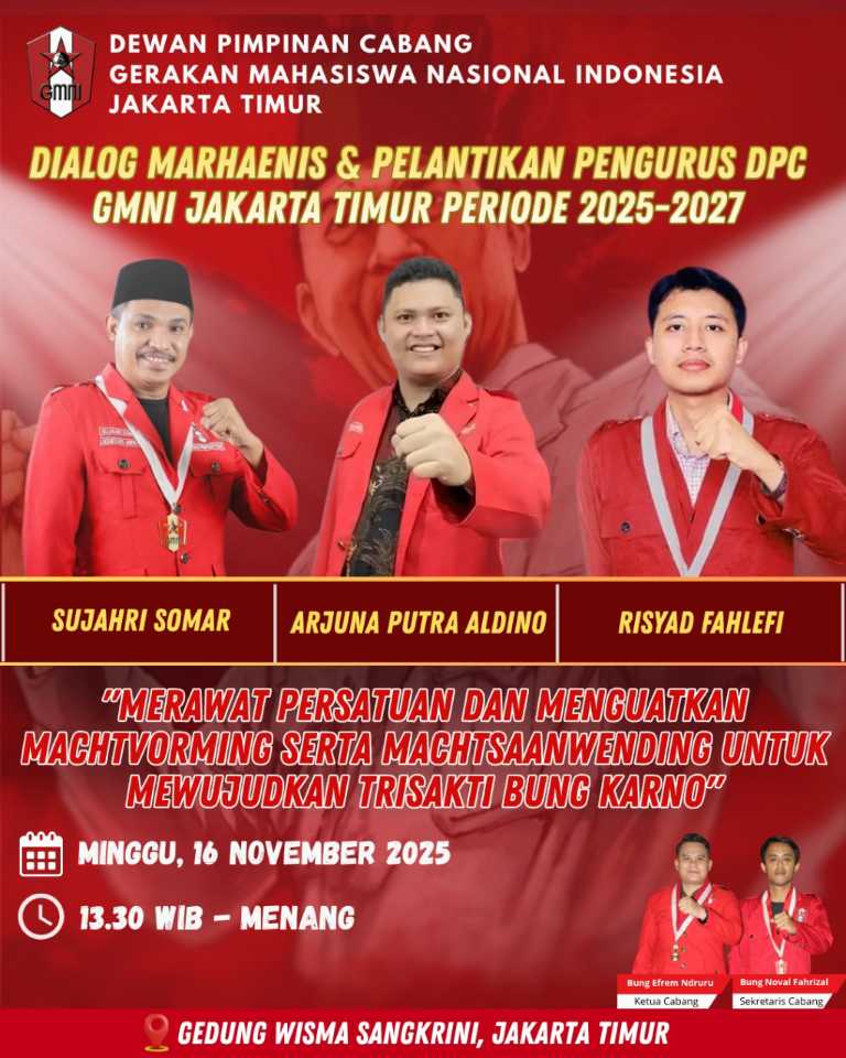 Marhaenist.id, Jaktim — Dengan semangat Trisakti Bung Karno, Dewan Pimpinan Cabang (DPC) Gerakan Mahasiswa Nasional Indonesia (GMNI) Jakarta Timur (Jaktim) akan menggelar kegiatan Dialog Marhaenis sekaligus Pelantikan Pengurus Baru periode 2025–2027.