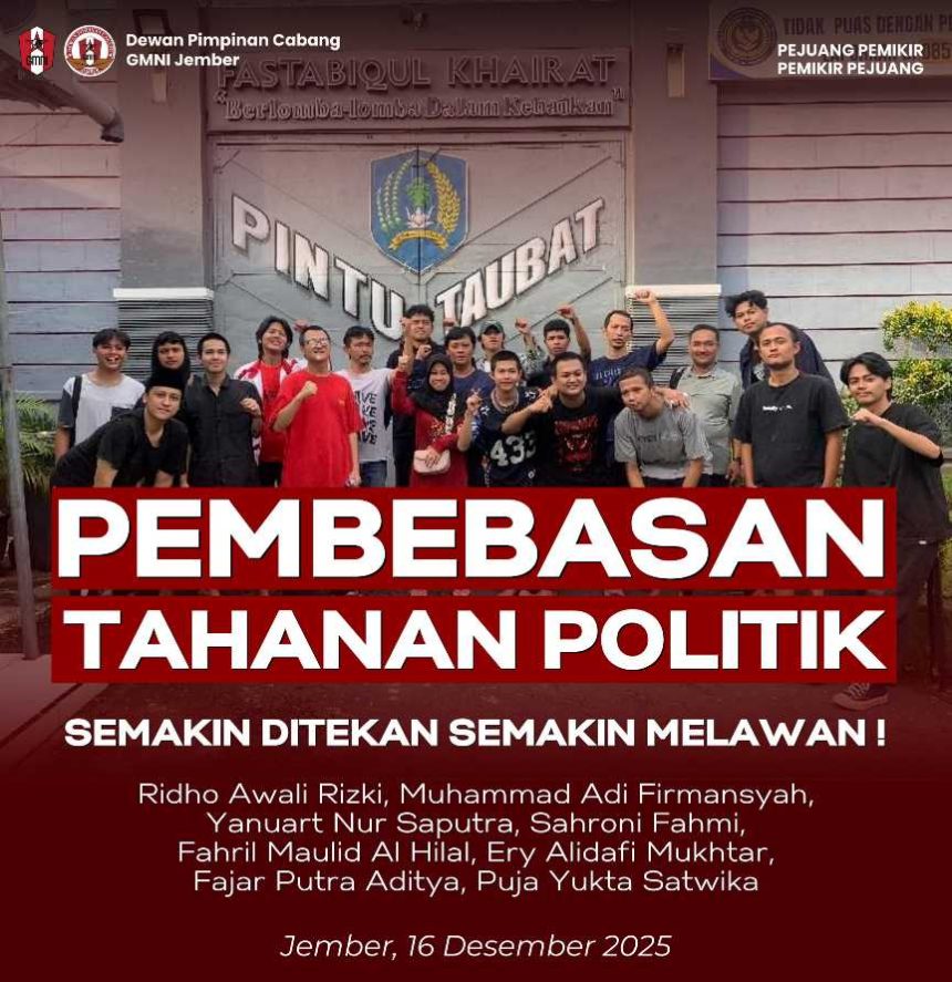 “Pembebasan ini bukan sekadar peristiwa hukum, melainkan pengakuan atas daya tahan perjuangan yang dijalani secara terus-menerus dengan keteguhan dan konsistensi,” demikian pernyataan GMNI Jember yang diterima, Selasa (16/12/2025)