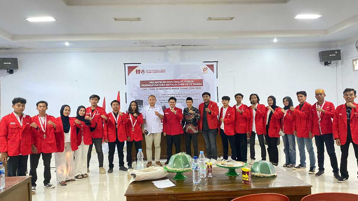 Marhaenist.id, Jeneponto — Dewan Pimpinan Cabang (DPC) Gerakan Mahasiswa Nasional Indonesia (GMNI) Kabupaten Jeneponto sukses menggelar pelantikan pengurus masa juang 2026–2028 yang dirangkaikan dengan dialog publik serta pemotongan nasi tumpeng dalam rangka peringatan Dies Natalis GMNI ke-72.