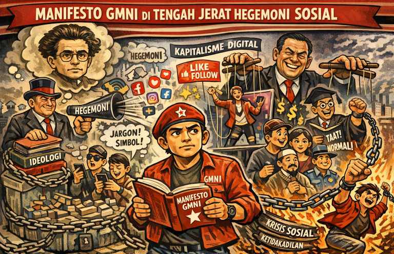 Marhaenist id – Di tengah derasnya arus perubahan sosial, politik, dan kultural yang kian kompleks, keberadaan manifesto dalam tubuh Gerakan Mahasiswa Nasional Indonesia (GMNI) menghadapi tantangan yang tidak sederhana. Manifesto yang sejatinya lahir sebagai panduan ideologis dan alat perjuangan, kini kerap berada di persimpangan antara penghayatan dan formalitas, antara praksis dan simbolisme. Dalam situasi di mana hegemoni bekerja secara halus melalui budaya, media, dan logika kapitalisme digital, kesadaran kritis kader diuji: apakah manifesto masih menjadi napas gerakan, atau justru sekadar menjadi gema yang berulang tanpa daya ubah.